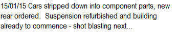 7th Feb 2015 - Awesome work being done in downland Somerset.. Turkey and home cured bacon rolls were pretty good.. 16th February 2015 - More work carried out without the chef... Chasis looking great - subframe sorted and new shock support created. Body work in place rear arms being created soon. Weber Carb serviced... License applied for... Apologies for picture quality lens must have got something on it...